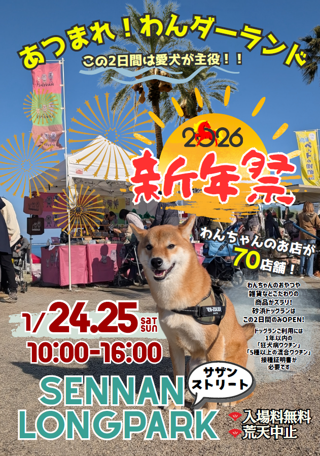 【開催中止のお知らせ】1月24日(土)、25日(日)あつまれ!わんダーランド🐶 2026 1/24 お知らせ 2026.01.24 1月24日(土)、25日(日)に開催を予定しておりました 泉南牡蠣まつり は 残念ながら暴風による悪天候の為開催中止となりました。 楽しみにして下さっていた皆様には誠に申し訳ございませんが何卒ご理解のほど お願い申し上げます。 お知らせ 2026年1月17日(土)~2026年3月29日(日) 土日祝のみ 泉南牡蠣まつり